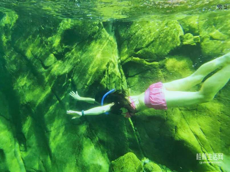 漓源瀑布下的潭水透明度可达5米以上,阳光照射时,水色由碧绿渐变为蒂芙尼蓝,水面如凝固的琉璃,水下卵石纹理清晰可见,堪称广西水质天花板级的自然泳池。