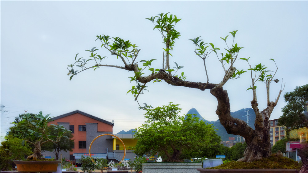 在我们的印象里,桂花都是一株株的树木,像这样一盆盆匠心雕琢的精致桂花盆景并不多见,它们就像是桂树基因与当代园艺美学咫尺天地间的碰撞。就像这一盆巧妙融入我们桂林城徽象鼻山的盆景,真是惟妙惟肖。
