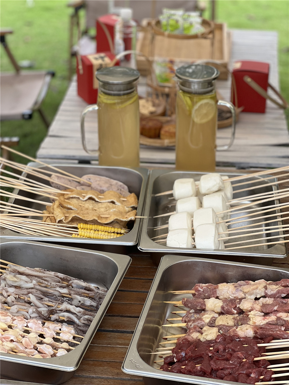 我们点的是6-10人份368元的烧烤套餐,有清冽的桂香冷萃茶、软糯的桂花糕、甜香的桂花雪花酥、各式让人垂涎欲滴的烧烤食材······