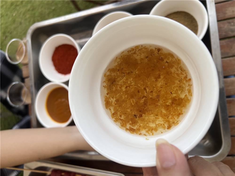 各式烧烤酱料中,最爱这一口桂花酱的香气,桂花香的烧烤,每一口都是被香气包裹的秋日限定美味,真的超好吃。