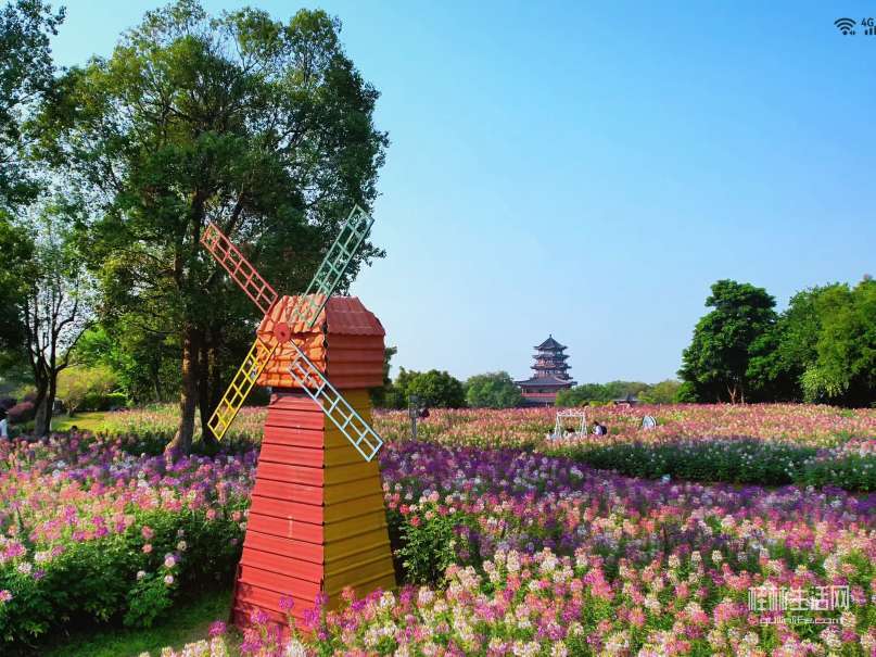 秋风拂过,掀起层层花浪,一朵朵、一簇簇、一片片,与天边的云彩、亭台楼阁交相呼应,美不胜收。