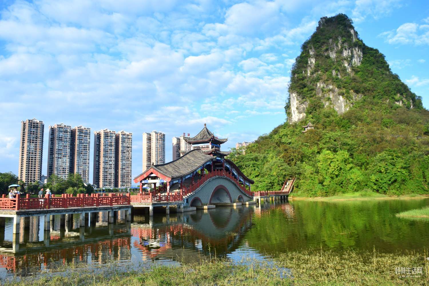 桥后几座高楼矗立,见证罗城的发展速度。。。
