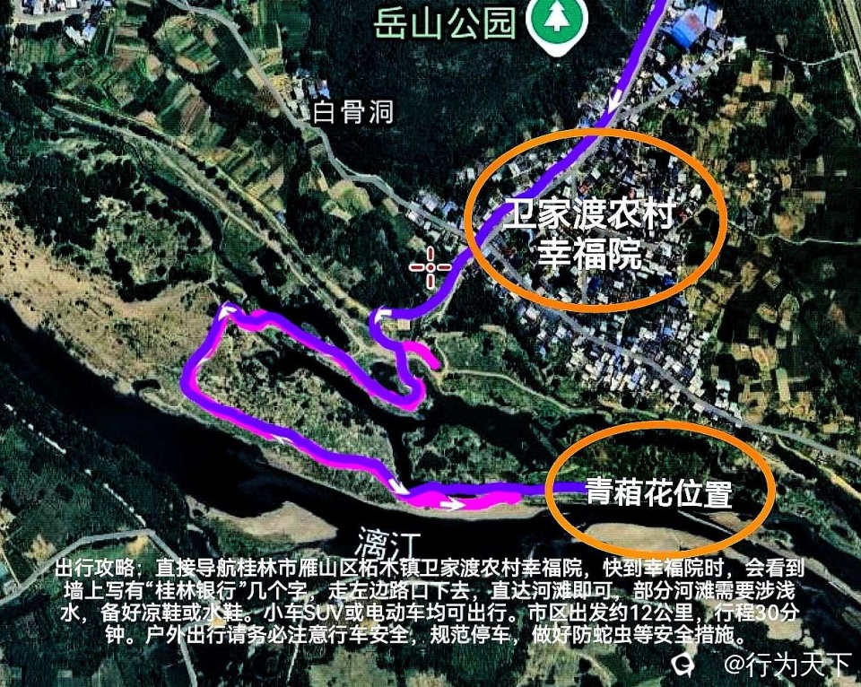 出行攻略:直接导航桂林市雁山区柘木镇卫家渡农村幸福院,快到幸福院时,会看到墙上写有“桂林银行”几个字,走左边路口下去,直达河滩即可,部分河滩需要涉浅水,备好凉鞋或水鞋。