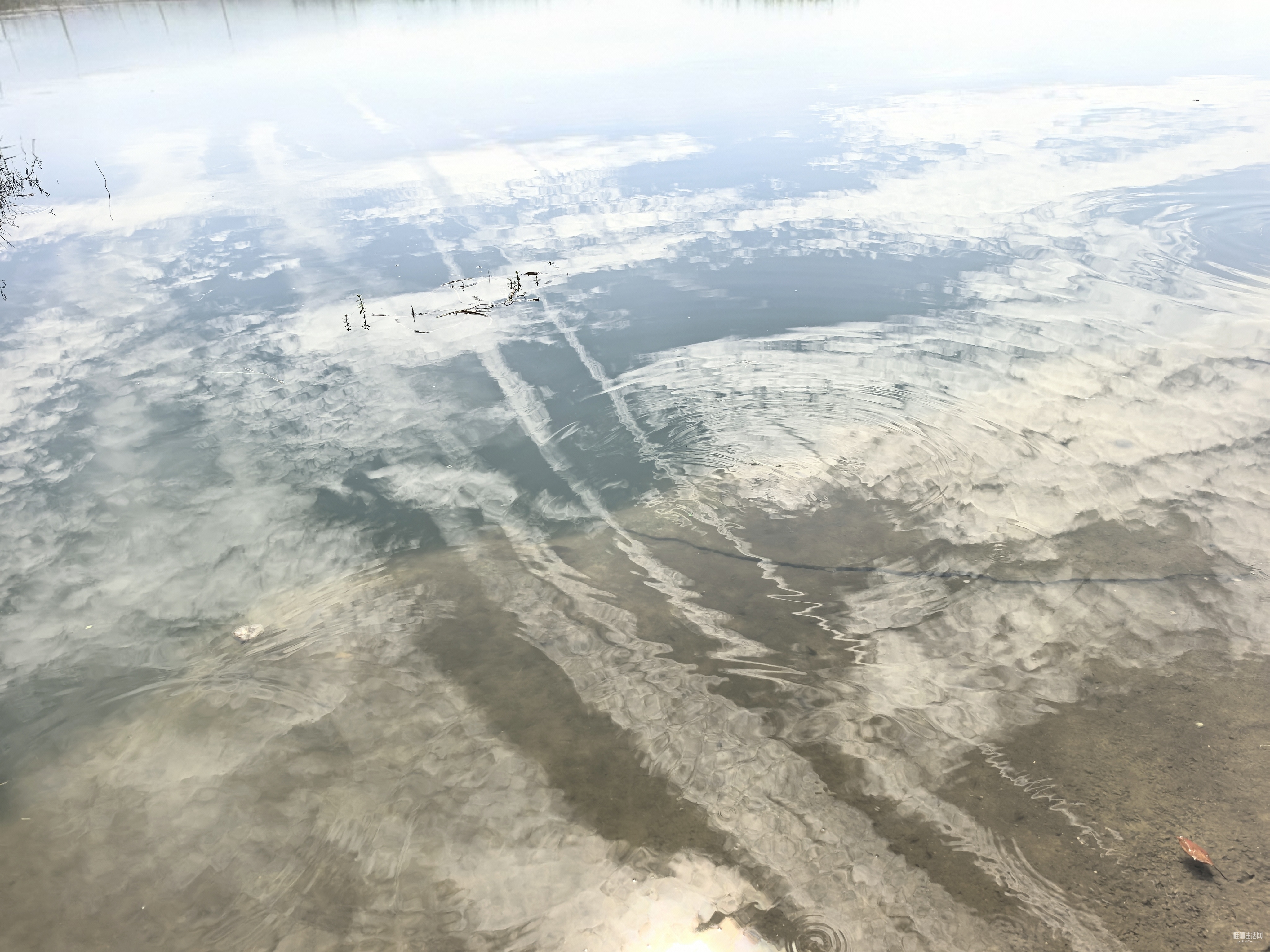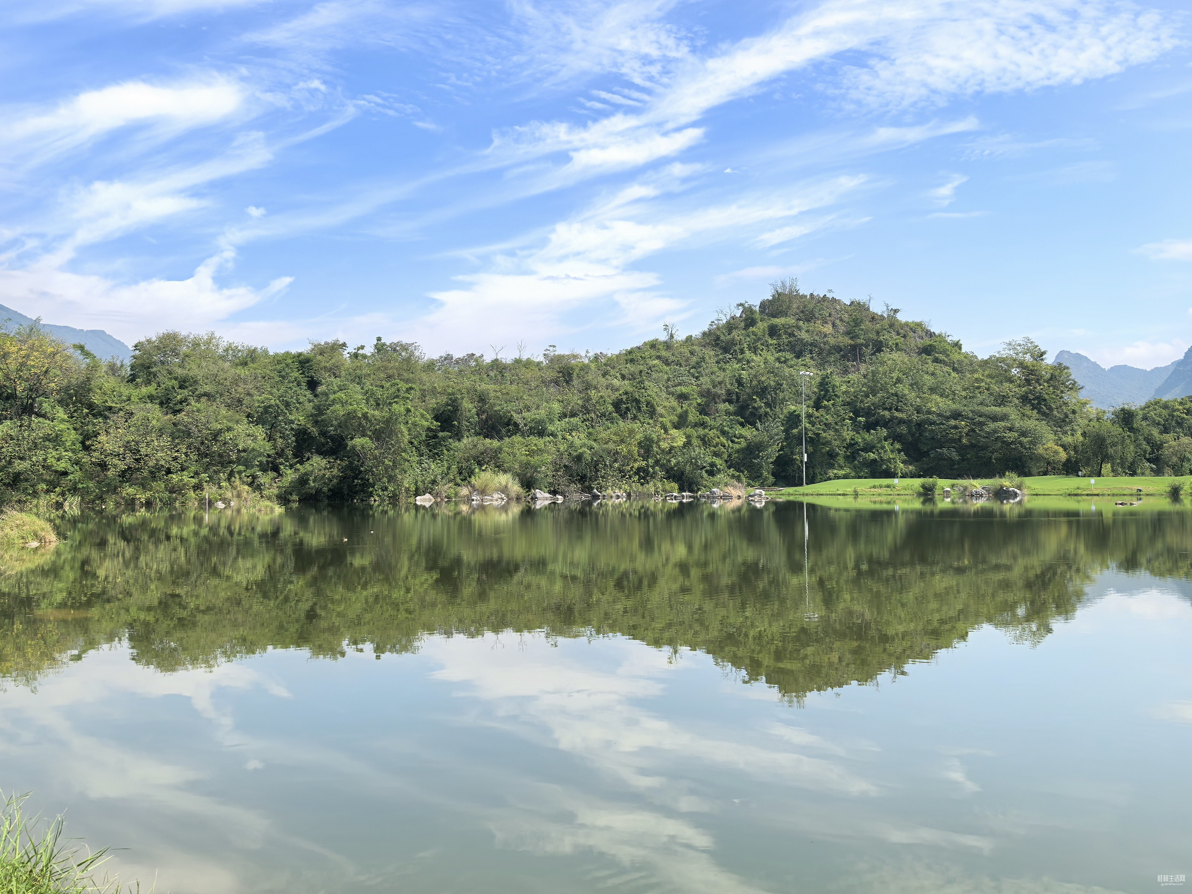 秋天的天空如洗过的蓝,干净得没有一点杂质;白云如天马行空折射出来的倒影映在水面上;山脚下的湖水静得出奇厉害。