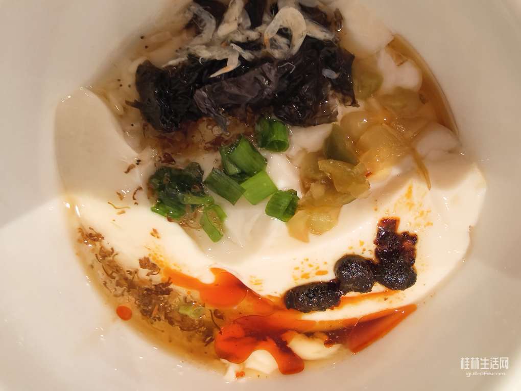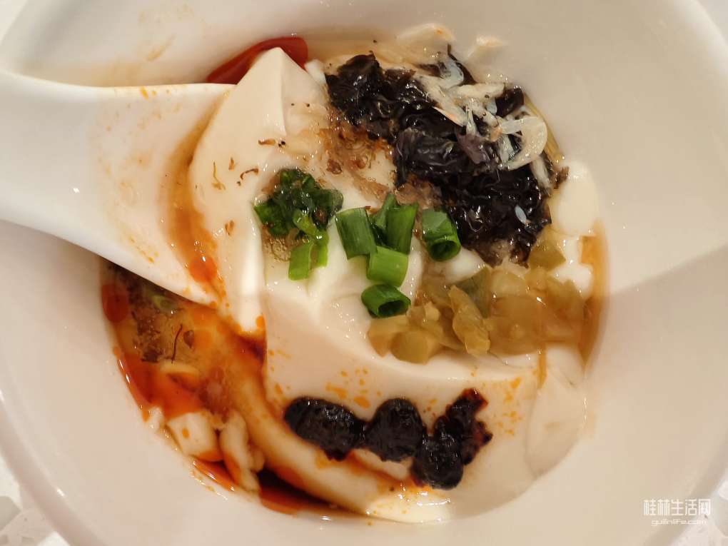 豆花还冒着热气。勺点榨菜末,来点毛虾皮,撒了紫菜絲,稍加几颗辣油豆豉,添点酱油,香醋,麻油。见有桂花蜜,也来它一勺。再撒点葱花。豆花吃时分咸甜口两种。甜的可加白糖或片糖,桂花蜜。咸的通常就如本人如上操作,不加桂花蜜。今天是来了个咸甜混搭。豆花入口,豆香细滑,稍麻辣的豉香先浸透味蕾。咸嫩的榨菜未,带着海味的毛虾皮、紫菜絲接蹤而来。细细品之,桂花蜜的香甜才慢漫渗出。哈,这一碗混搭的豆腐脑,蛮绝的!