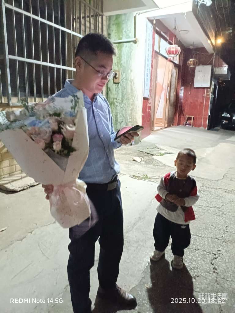 宝妈有人送花,奶爸带儿子出来接花,可怜偶这个老鬼骑手饿着肚子送花,甲山沟里面,路灯都木有几昝。送花的人不知道为什么总喜欢送这种要不红的花,偶最讨厌送花价值不大,发货方又要求不能后箱盖着,不能闷着,送到后对方就是看两天就是不懂事的小孩喜欢。拉咕咕怎么都行