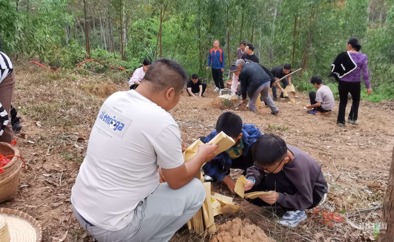 由于是土坡,还好,不算太难爬,很快就到老祖宗的地方,大家把箩筐里的贡品一一摆出来,斟酒,倒茶,上香,很是虔诚,然后双手合十,三鞠躬,再说一些心愿,再放鞭炮,礼炮,顿时四周硝烟弥漫,鞭炮声响彻山谷。