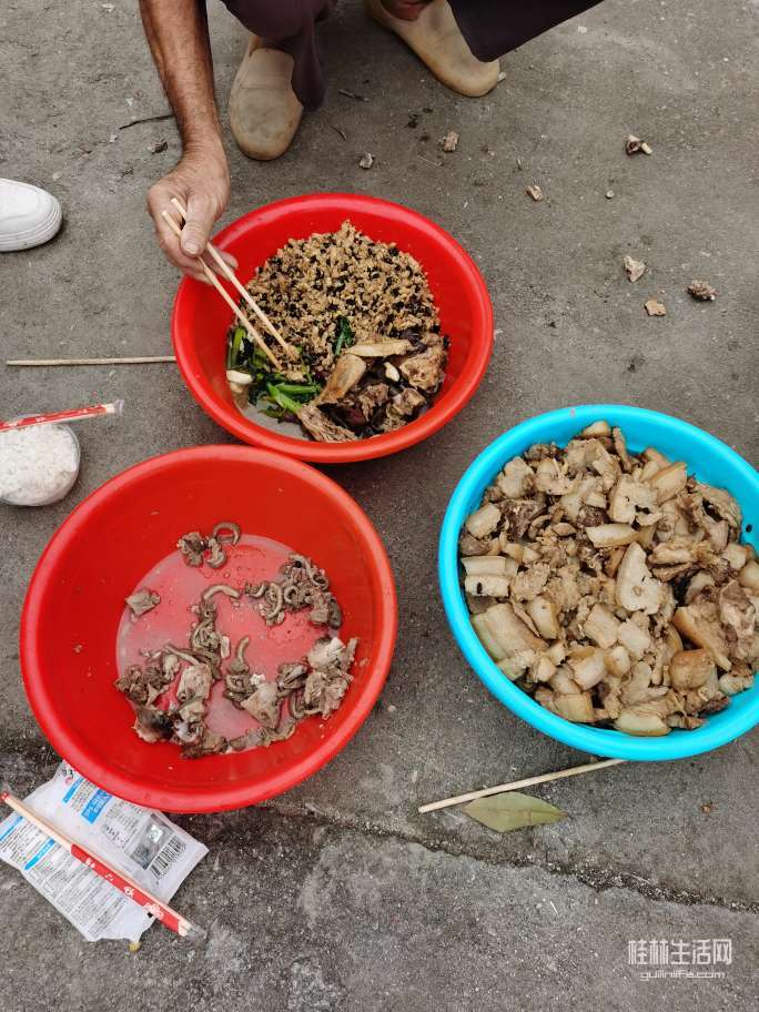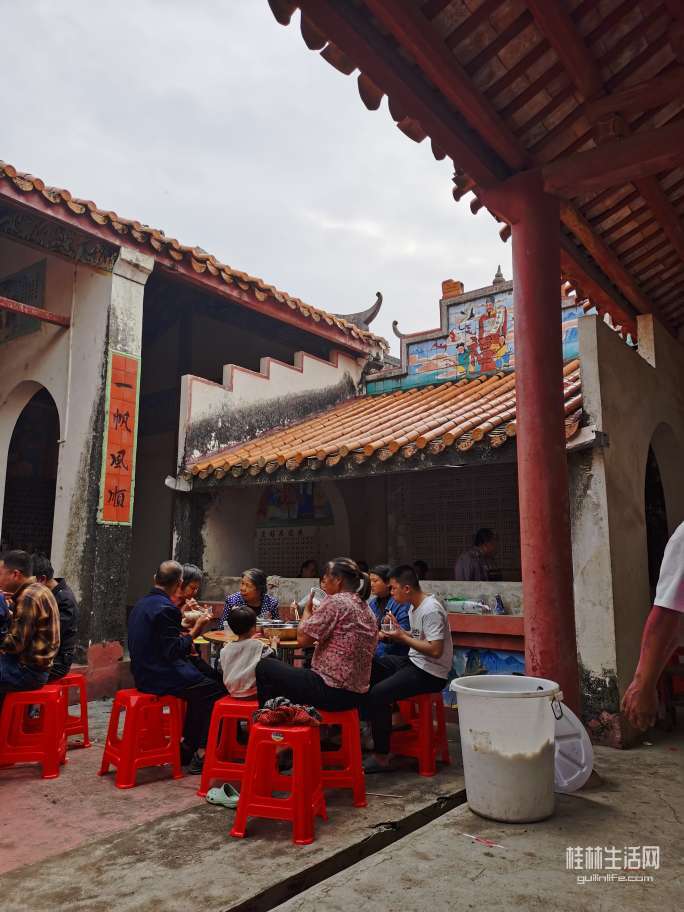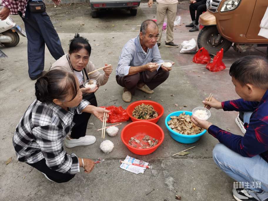 等到吃饭时间才赶到祠堂来吃饭,由于人员很多,超预期,没有那么多桌椅板凳,来的晚的,只好蹲在篮球架下吃饭。