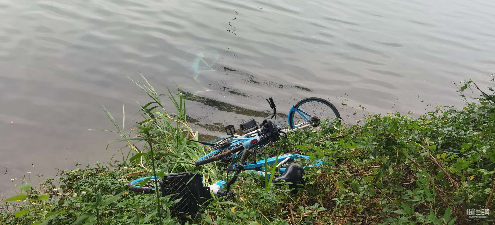 小东江江东桥东北角,几辆小蓝车被扔下了河堤,还有一辆完全泡在水里……唉,无语了