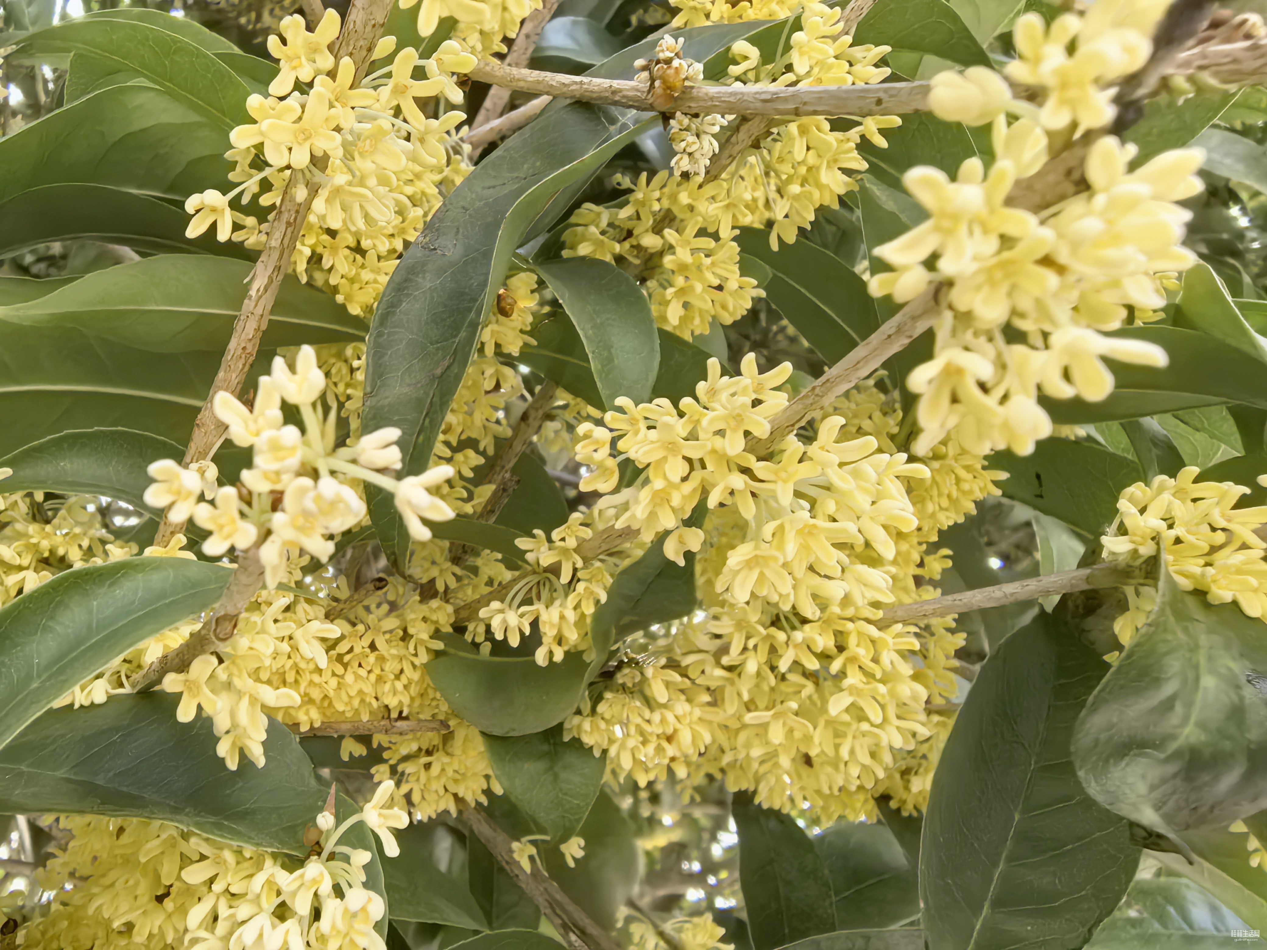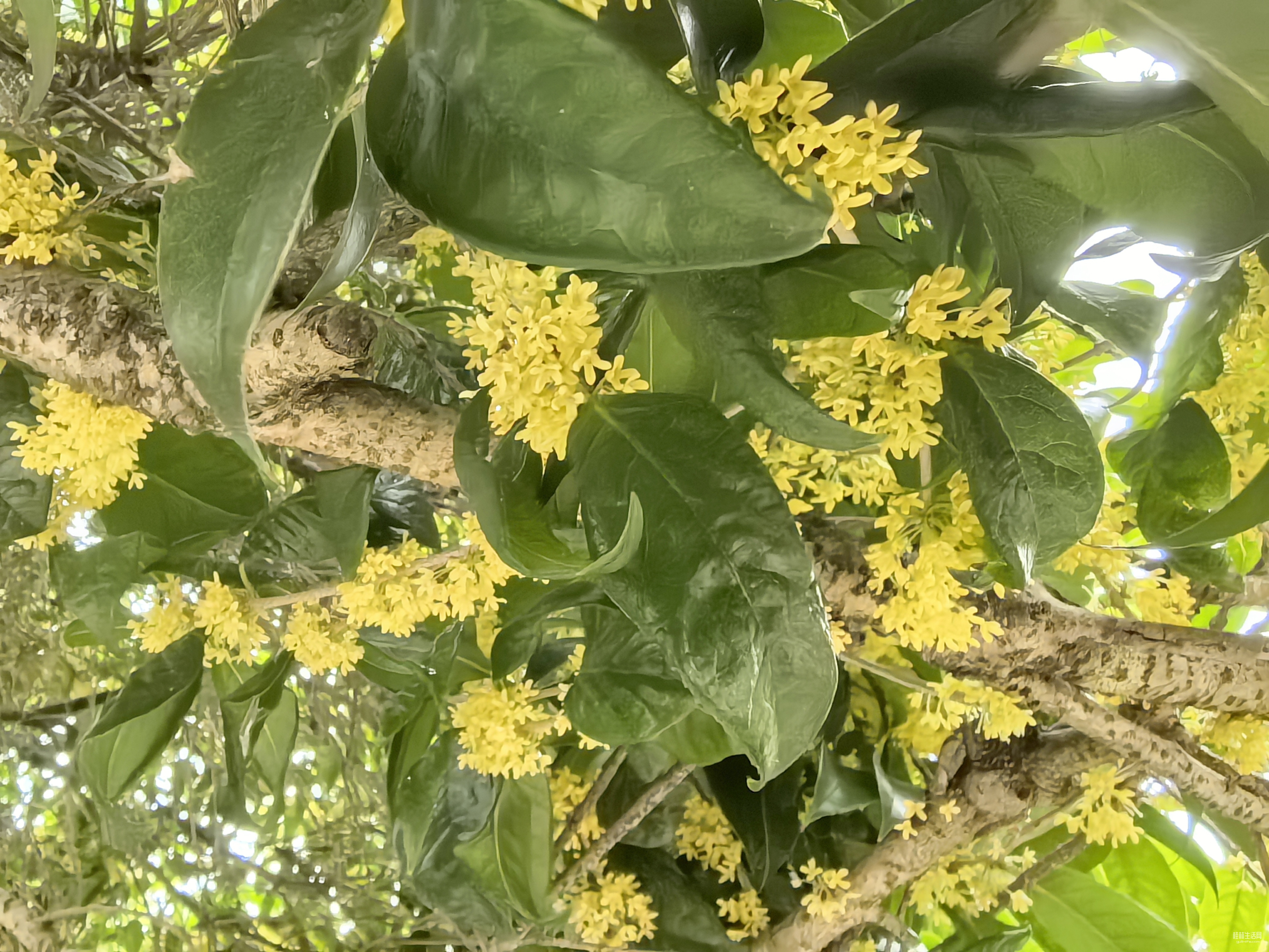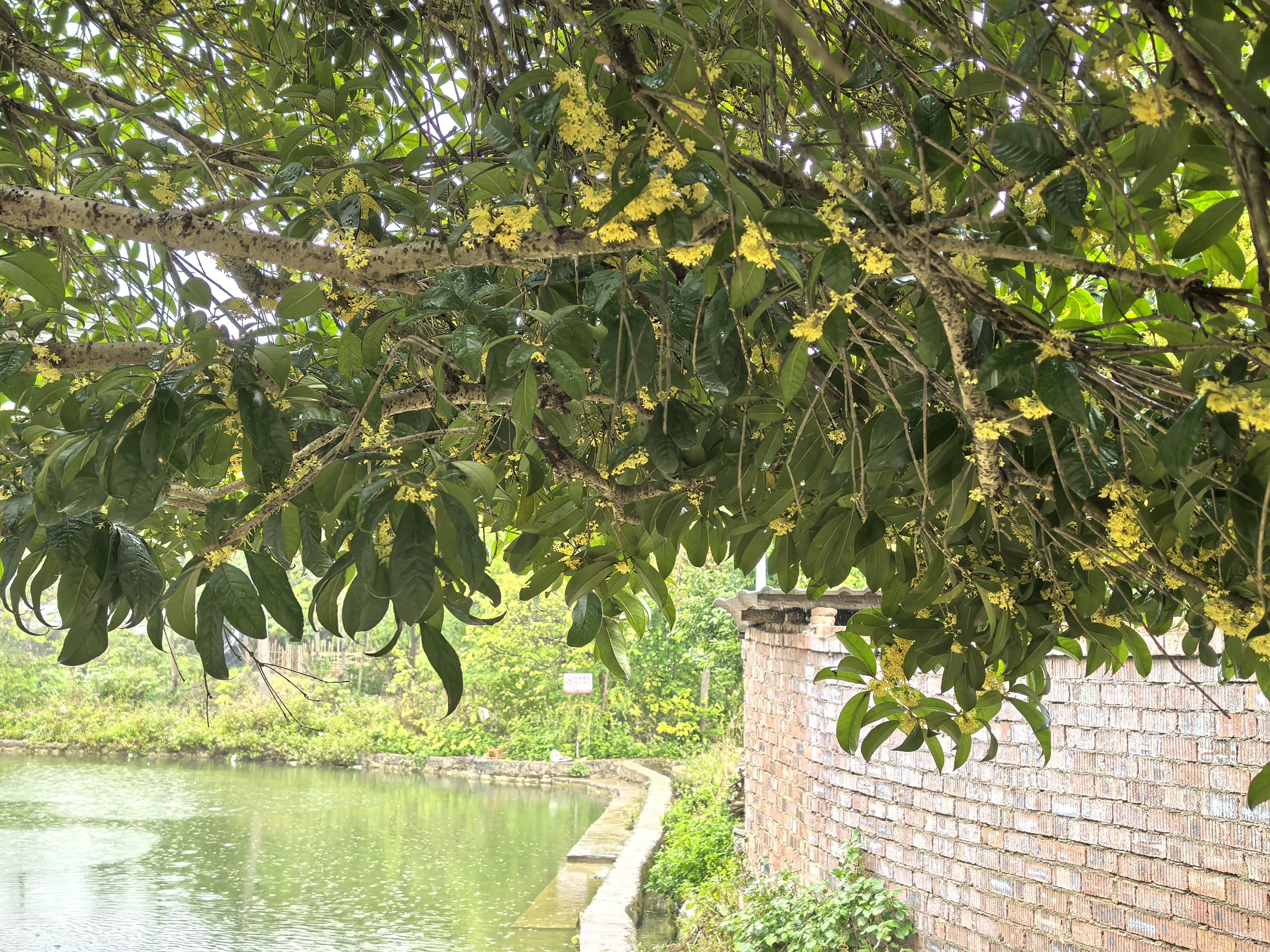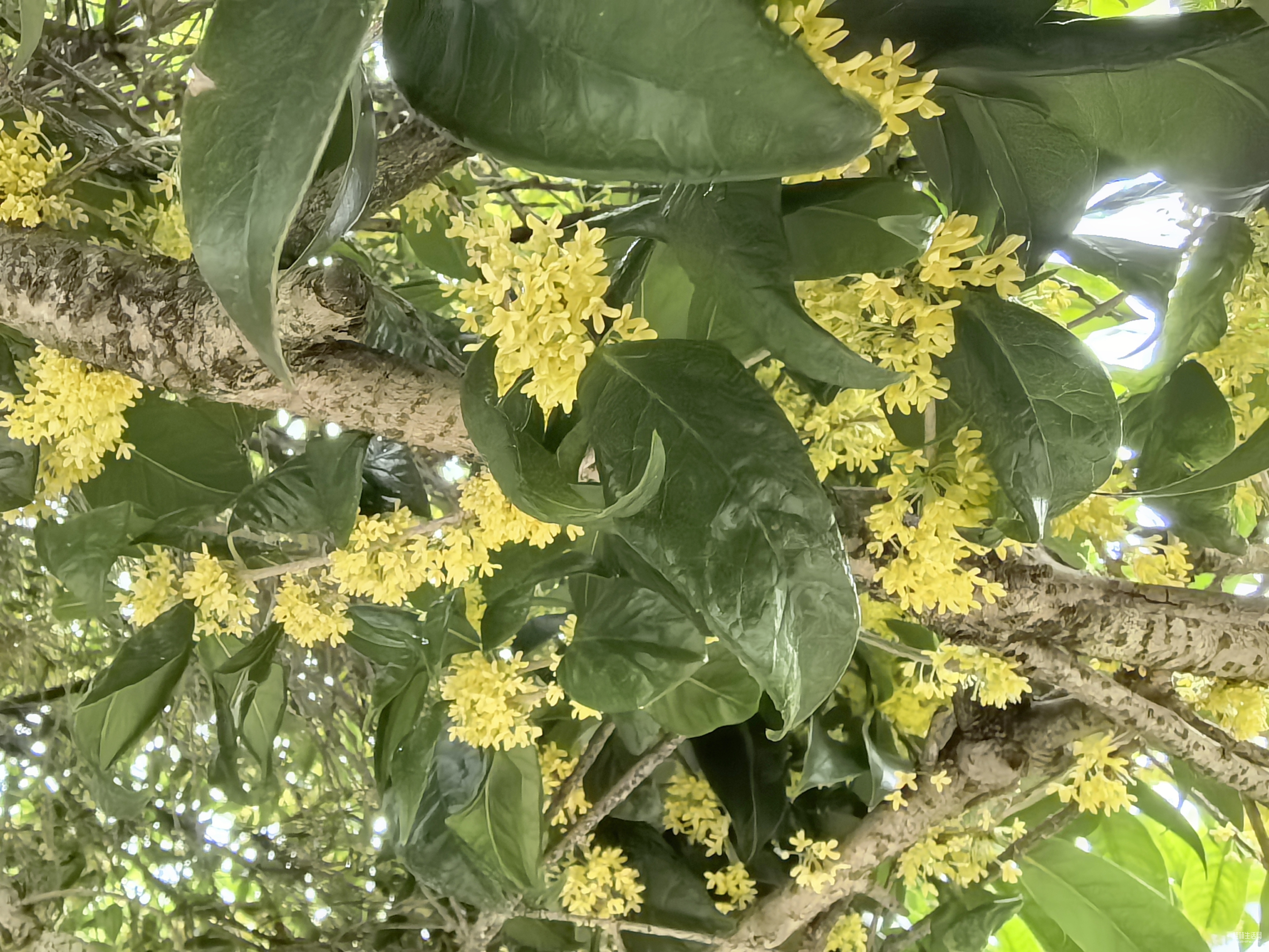 看着这满城的桂花开,我想着要趁早去赴一场乡村桂花约;所以今天冒雨赶往社塘村朋友家,就是去看看那棵我心心念念的桂花树。果不其然,快到她家门口时,就看到了满树藏不住的碎星星。朋友早在院门口等我了,她指着那棵老桂树说:“你看,下了雨更旺,香得连门前小河都沾了味”!我站在凳子上,凑过去细看,墨绿的枝叶间,满是挨挨挤挤的桂花;我小心翼翼地采摘花朵,放到罐子里,拿回去晒干,泡茶。