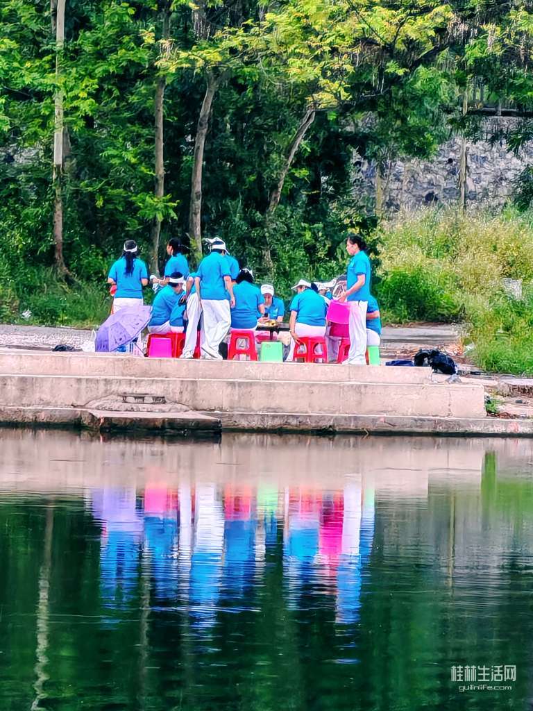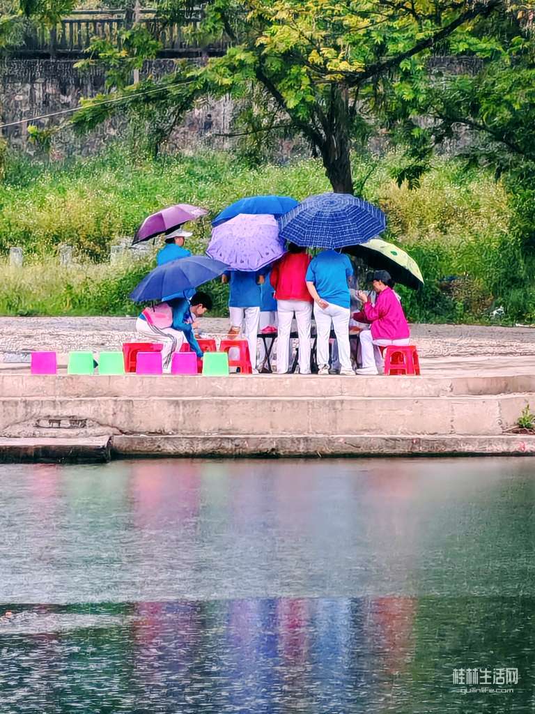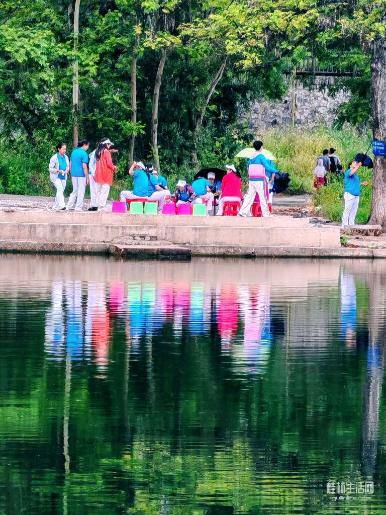 周末,河边江岸榉杨林下,一群中老年女性,穿红着绿,打着雨伞,乐趣无穷地野炊休闲,确实让人羡慕至极啊。