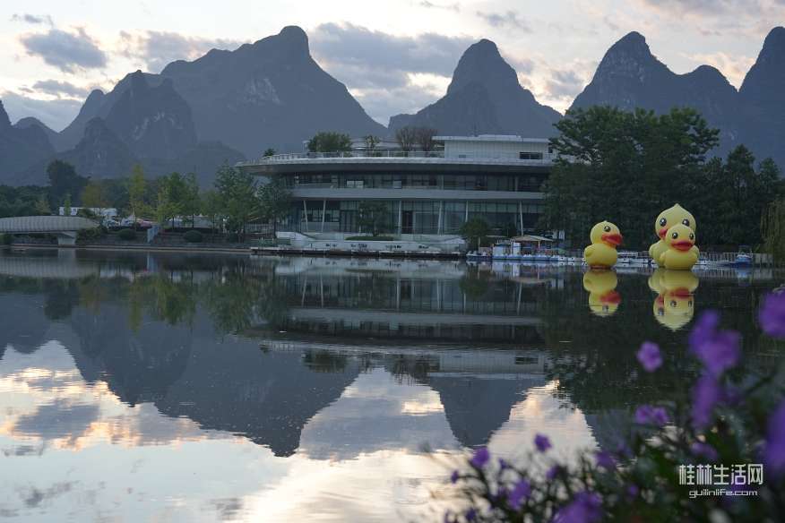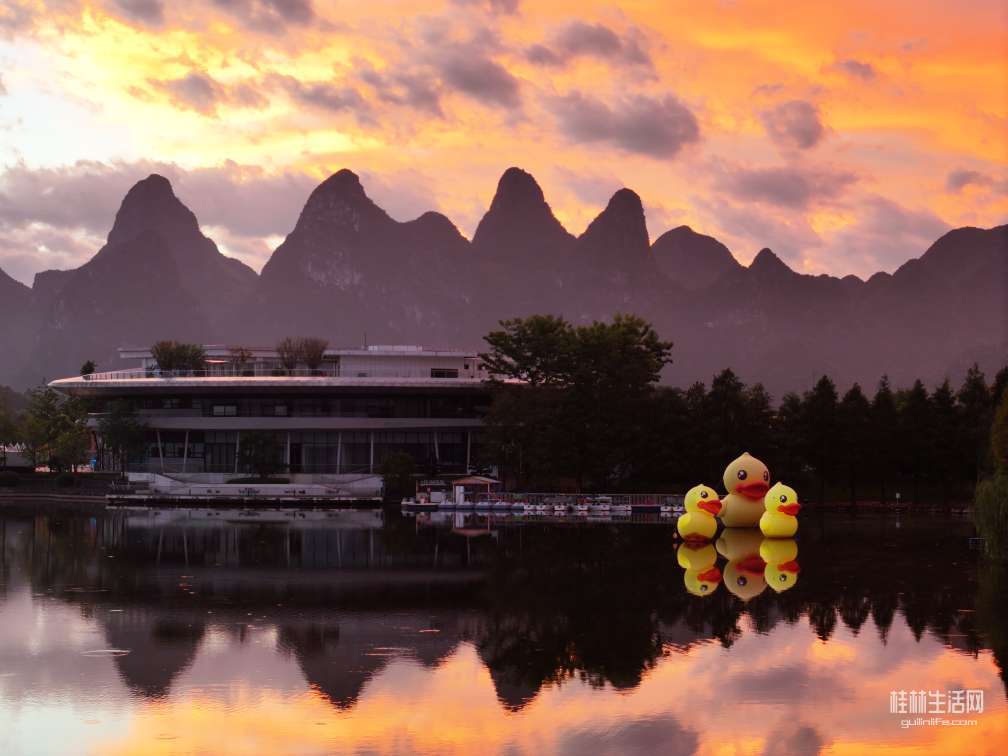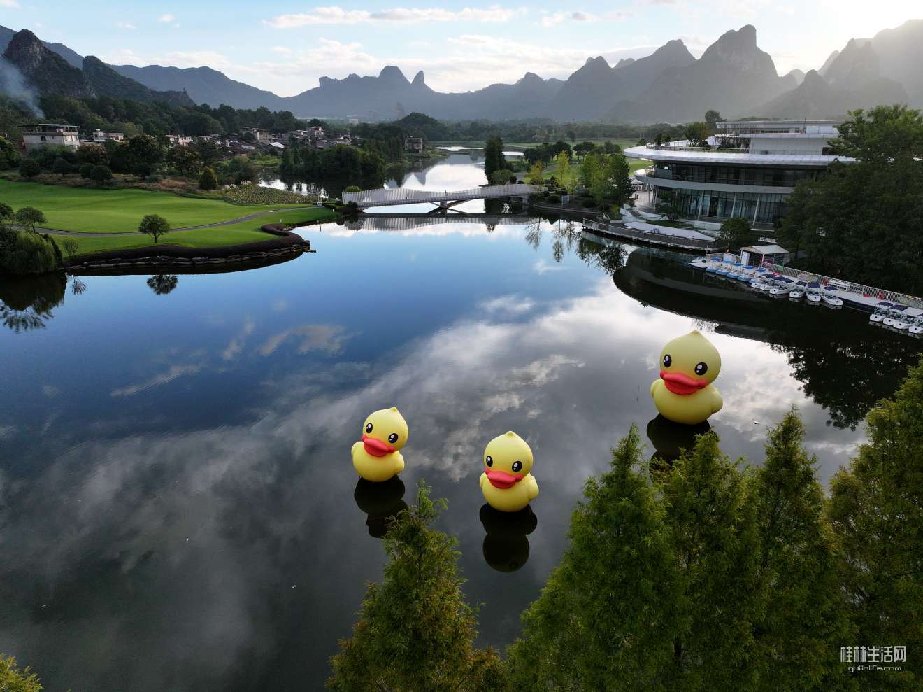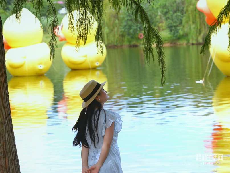 明净湖泊是镶嵌其上的蓝宝石,优雅的黑天鹅拨动清波,与湖边三两成群的俏皮“小黄鸭”雕塑相映成趣。