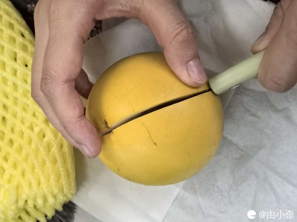 水果刀所留之处,感觉比橙子皮软很多,一切就开了。