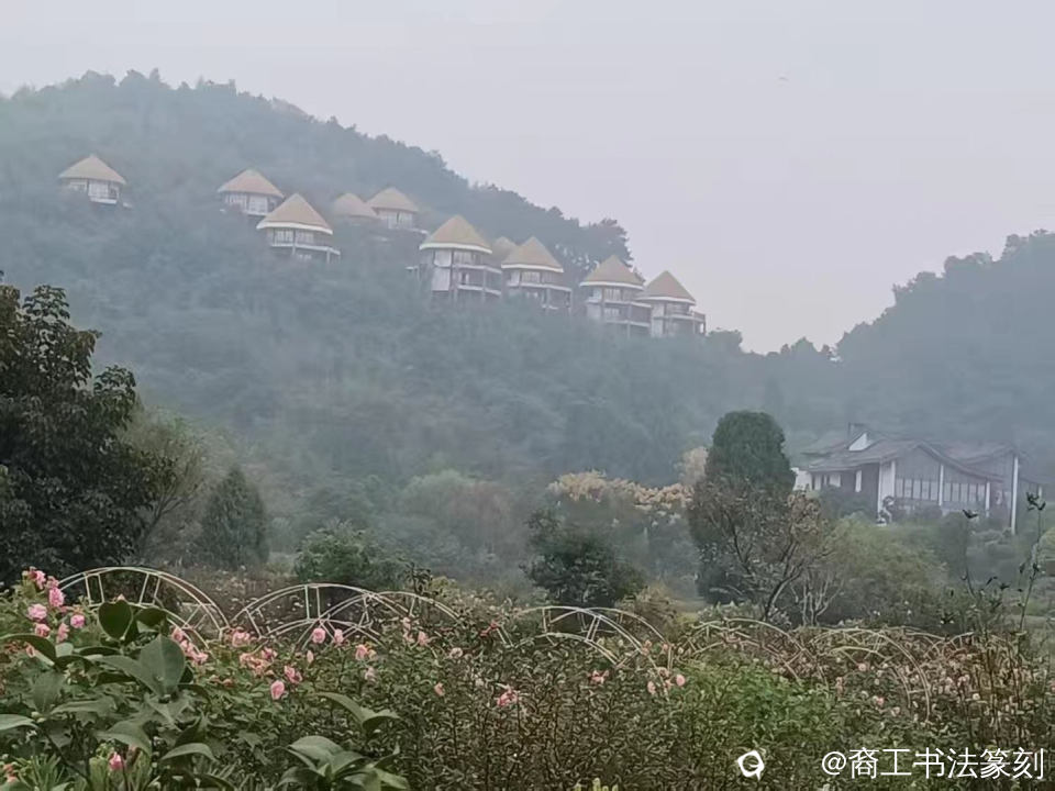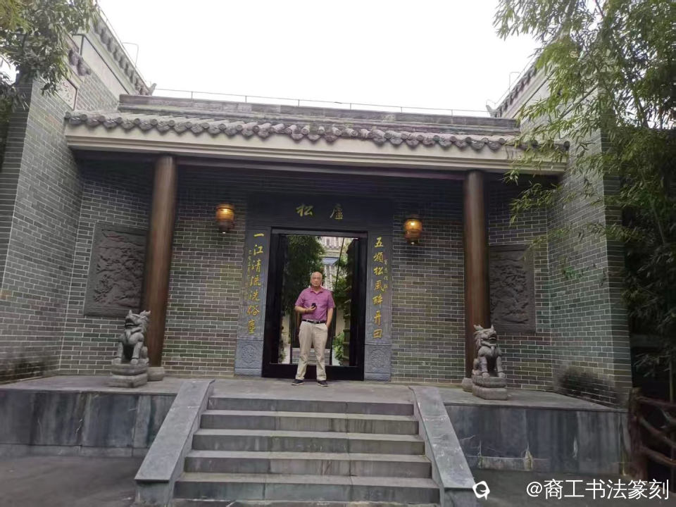讲解下方落款小字。意在说明是随笔记事不打草稿之作,用词不当缪误之处请多包涵。“二零二五年十月十三 应阳书记国亮兄之邀 到全州大碧头参加赋能乡村振兴文化活动 住汤院四合院式古朴典雅居 清晨小亭闲坐 听山岭间吹来之风 松枝摇曳拂面入心 爽神至极醉也”“此联刻于松庐门头 撰联者为大碧头国际旅游度假区 董事长宾恩信 自称好诗文擅对联 是位有文化有远见之企业家 祝大碧头蒸蒸日上 裔工挥之时七十五之年 气足也”这是我公开场合下初次用开叉斗笔挥下的巨幅之作。叉笔写字,颠倒了一般人包括书法爱好者的传统观念,最近网上吵起一幅字获奖得50万奖金,令人头昏脑涨,大喊书道变了。我还算冷静,不多舌,不鼓噪。自己多加努力。我的美篇《进漠川搭把手 振兴一下》也有讲到。