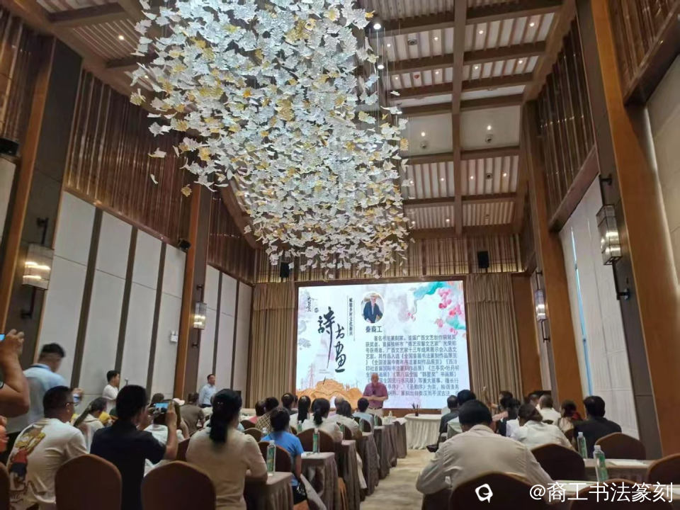 我了解到在座的有度假区员工、附近农人书画爱好者。他们正经端坐洗耳恭听。我大声呼唤他们,莫那么严肃,围拢过来看!