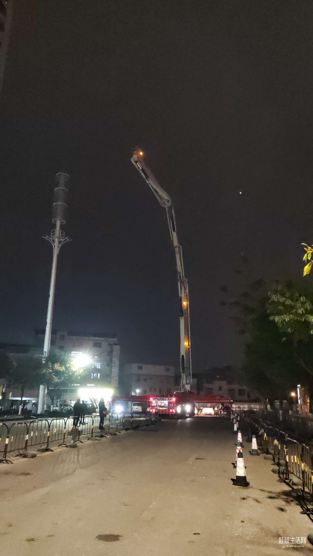 12月11日晚上八点多,在桂林临桂新龙路,一台大大的设备,正在发出作业的声音,同时伴随着闪闪发光的灯光,伸出了长长的手臂,在高楼旁的夜幕下作业。