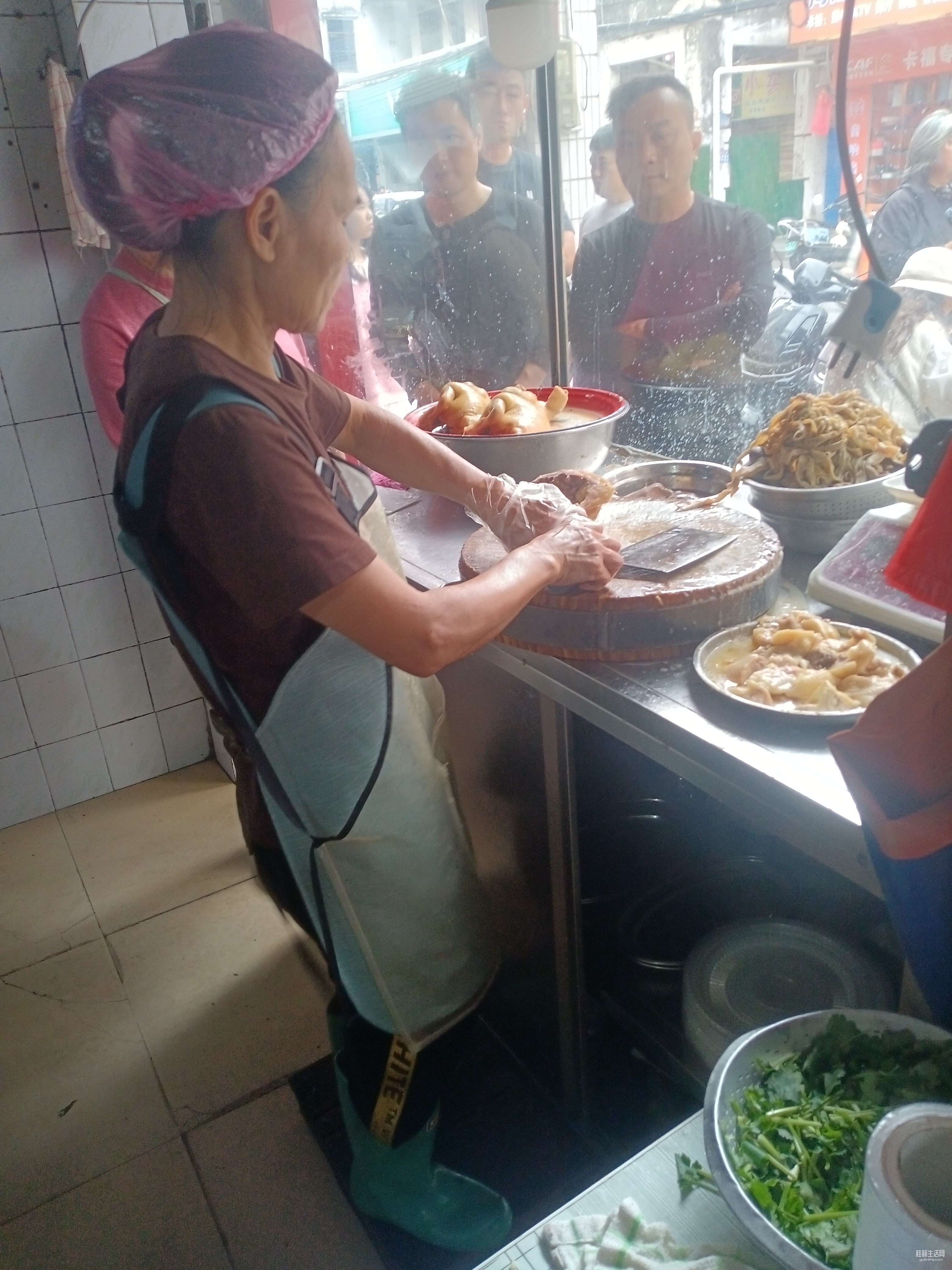 食客在人行道上排队,基本是外地来的游客,及“候鸟”。鸡饭店的老板娘,剁鸡,摆盘,配蘸料;配鸡肠;鸡血;香菜,,,,,包括结算,都是自己一个人亲力亲为,忙的不亦乐乎。