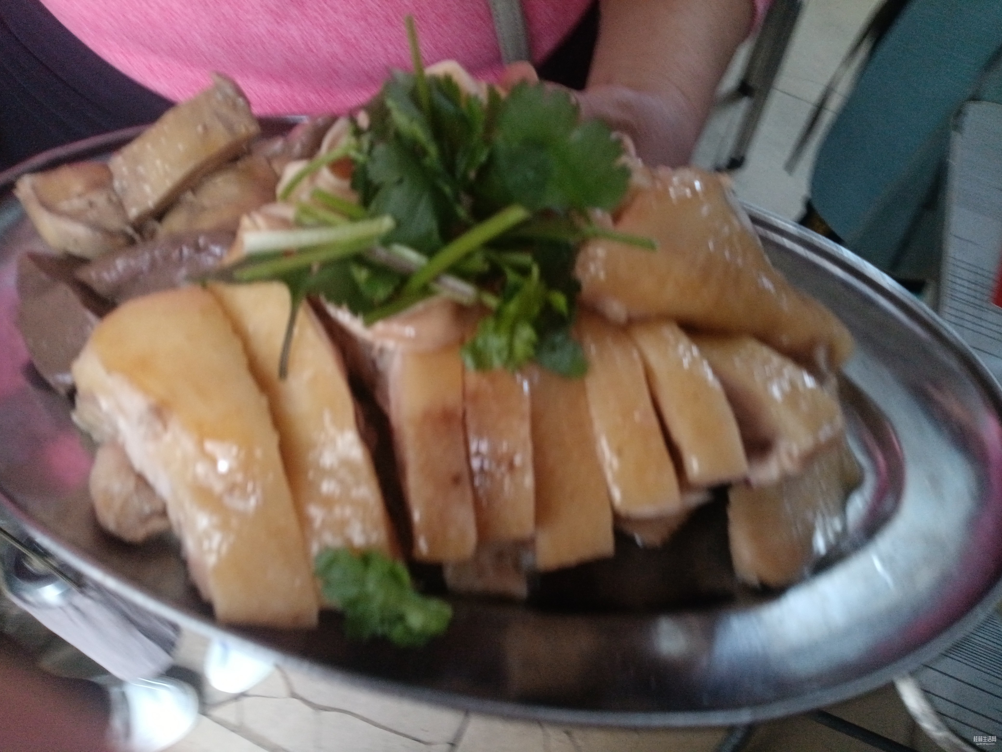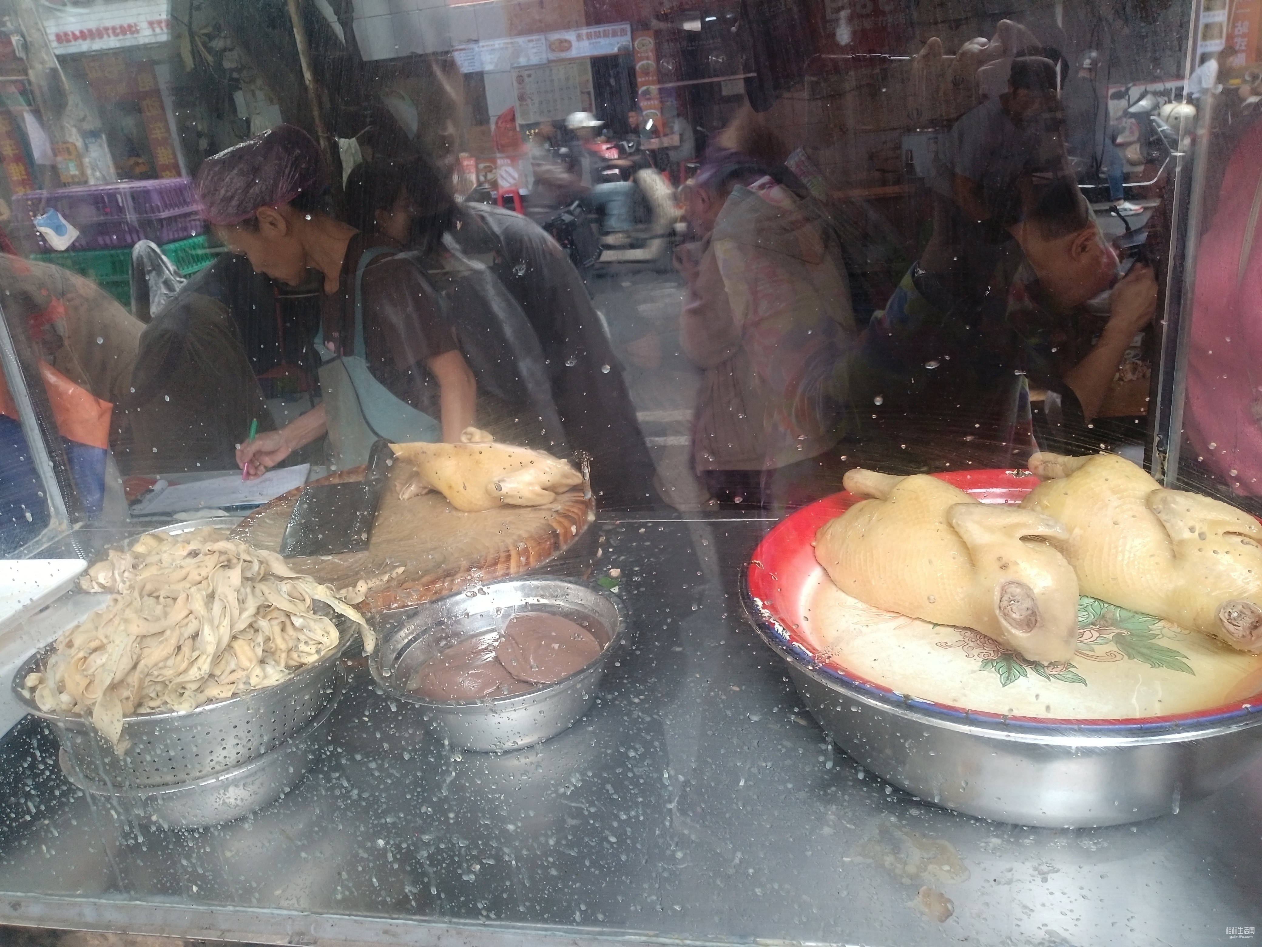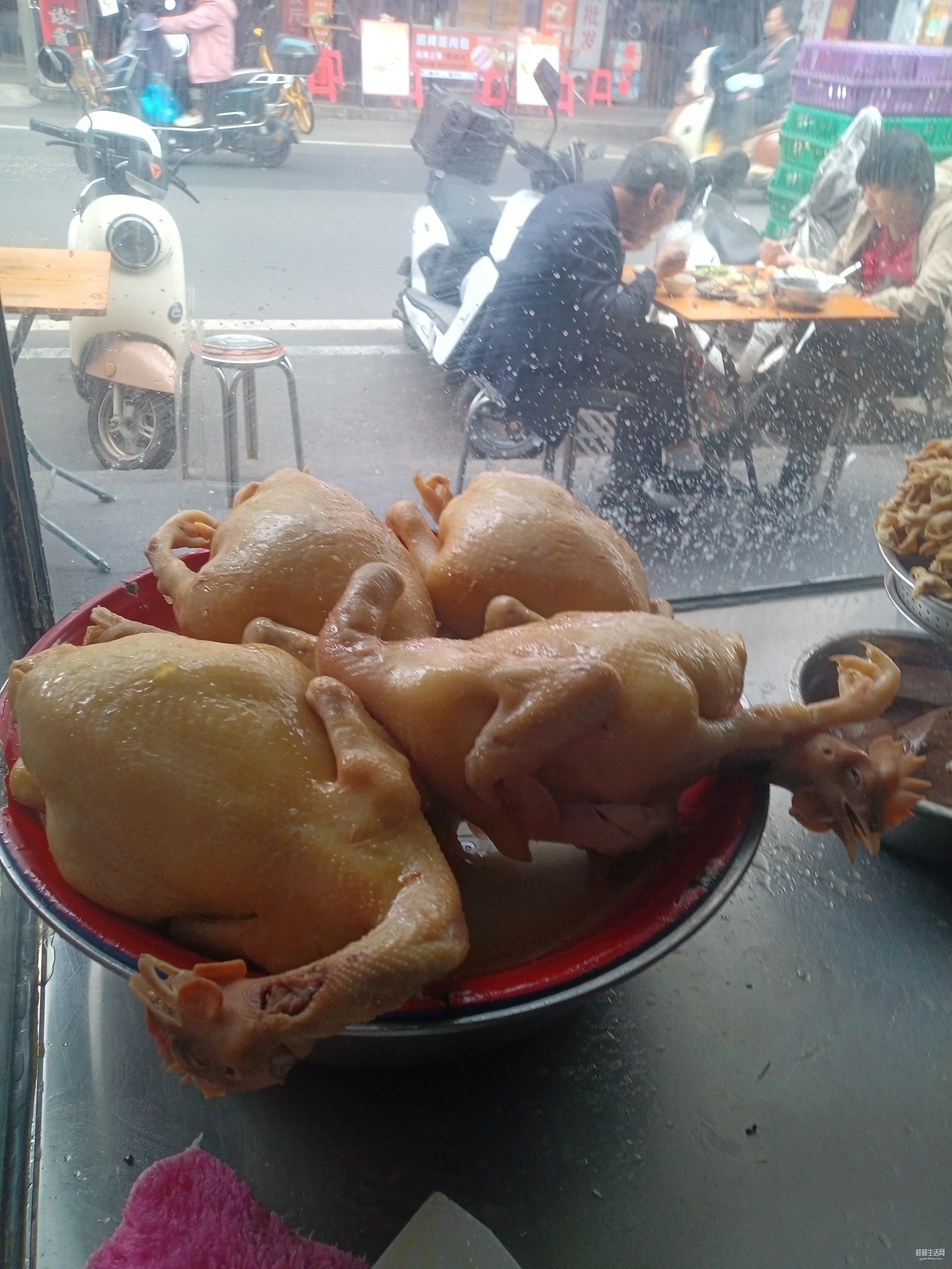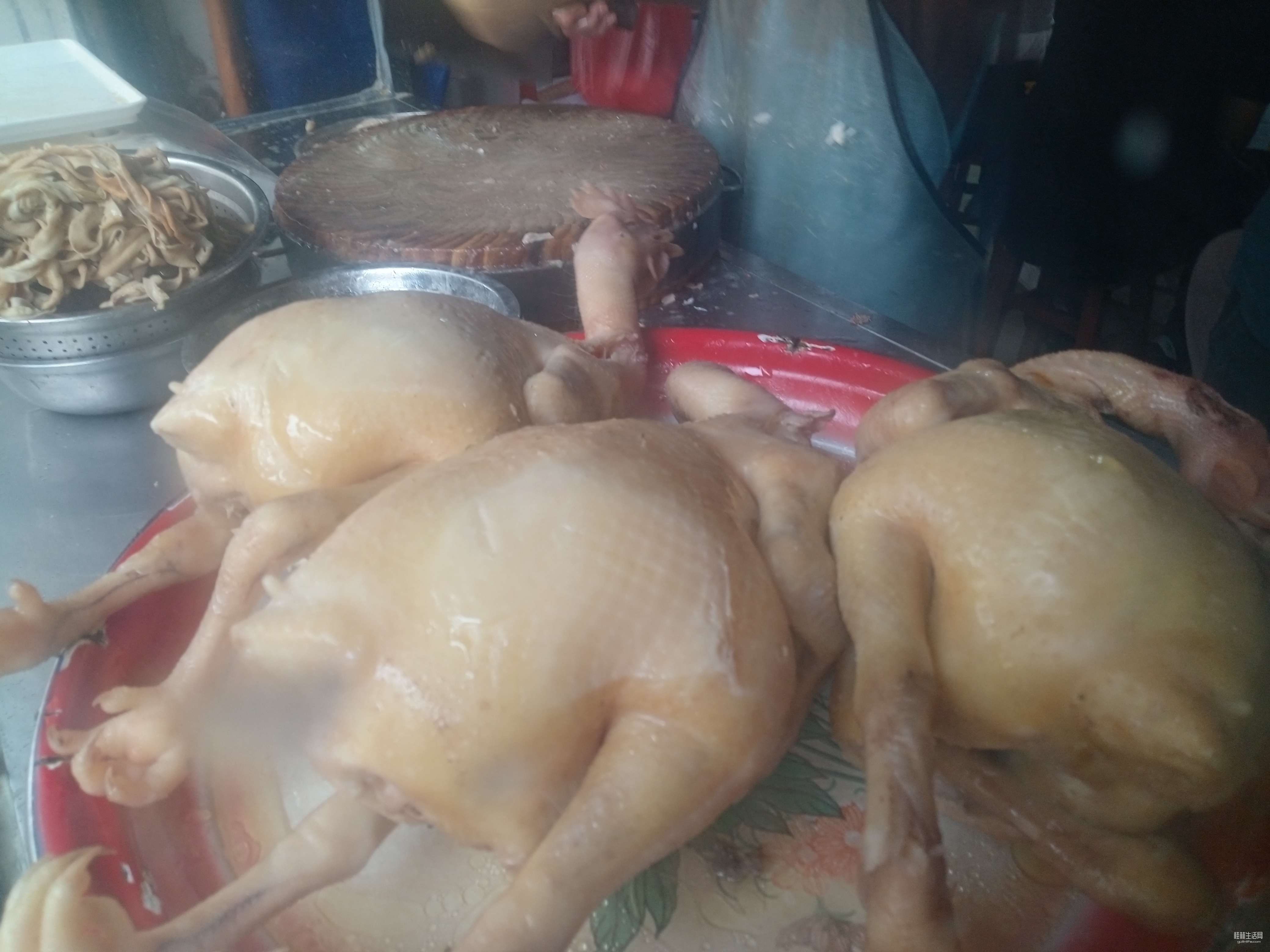 咱隔着玻璃拍的,摆在厨窗里的文昌白切鸡,油光水亮,圆滚滚的,好肥美呀。