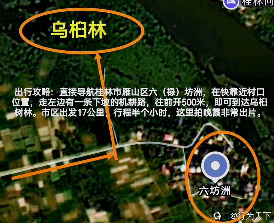 出行攻略:直接导航桂林市雁山区六(禄)坊洲,在快靠近村口位置,走左边有一条下坡的机耕路,往前开500米,即可到达乌桕树林。市区出发17公里,行程半个小时,这里拍晚霞非常出片。