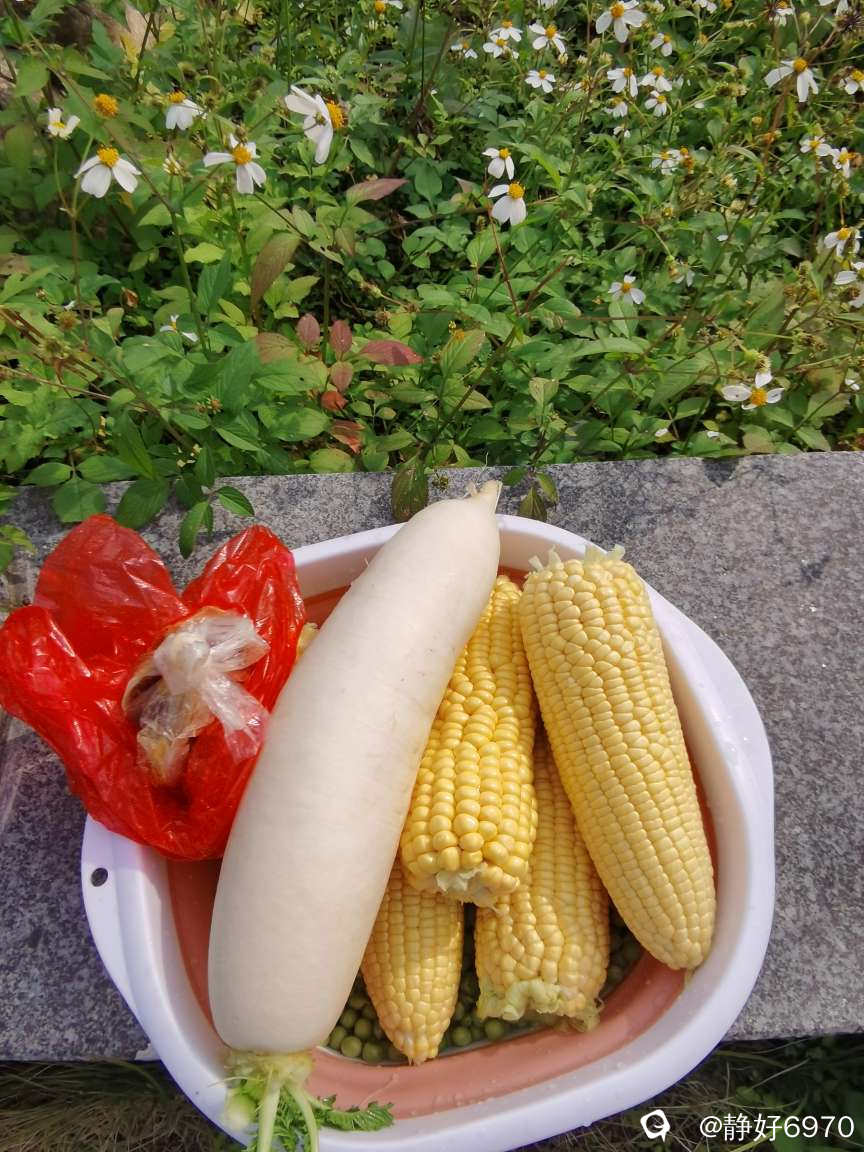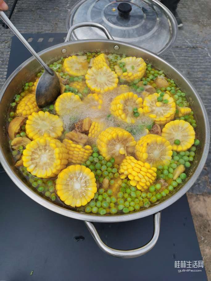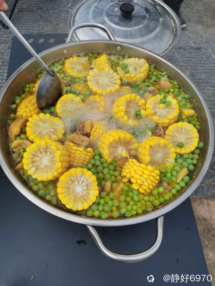 这边韭菜盒子煎好,那边又在喊,准备开饭了,今天是土鸡玉米豌豆汤,还配了萝卜,青菜,油豆腐,鱼丸烫菜,看见这满满一锅鸡汤,是不是色香欲十足。