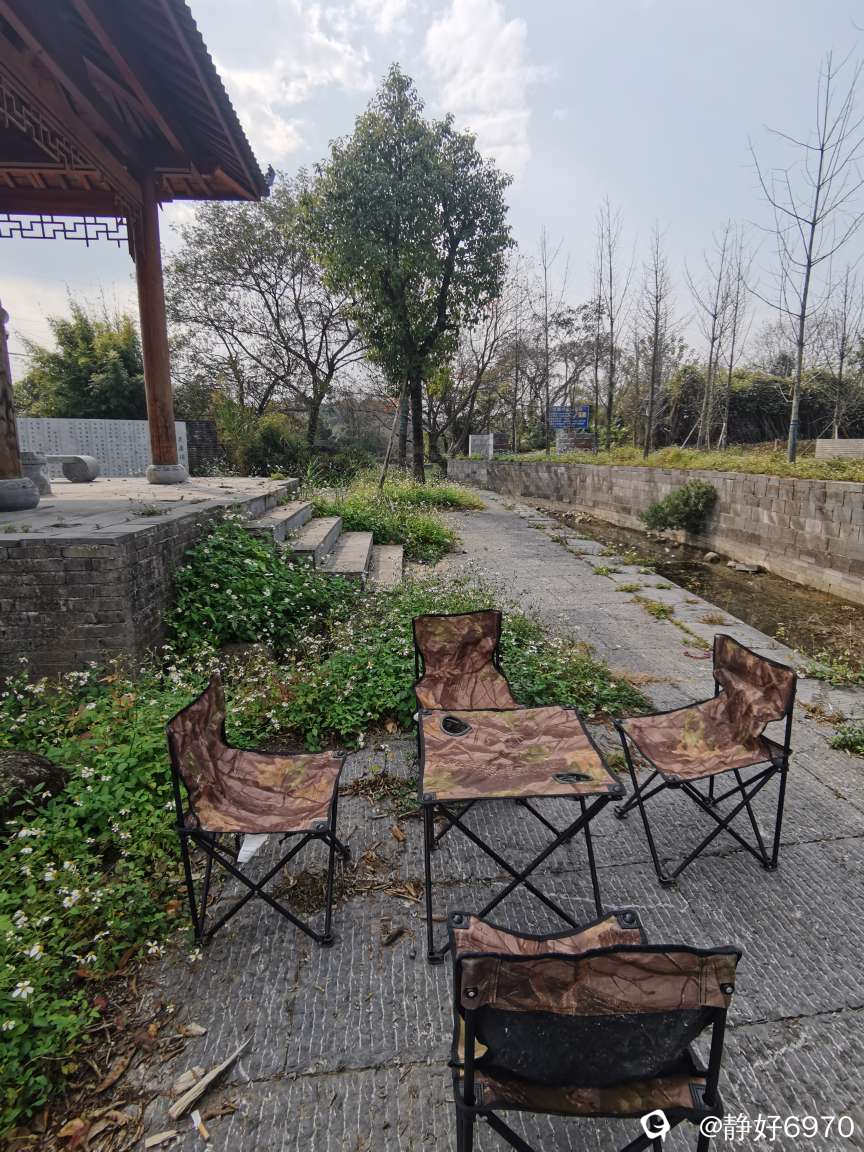 打卡完毕就驱车来到马头山驿站“野外摆摊”。这次工具齐全,炉具配套,连桌椅板凳也都是配套的,一看这两个司机就是强驴出身,装备太齐全,感觉什么都有。一停车先把喝茶的桌椅板凳摆好。