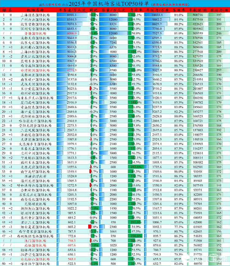 全国机场排名第48位,同比去年超越了拉萨贡嘎国际机场。