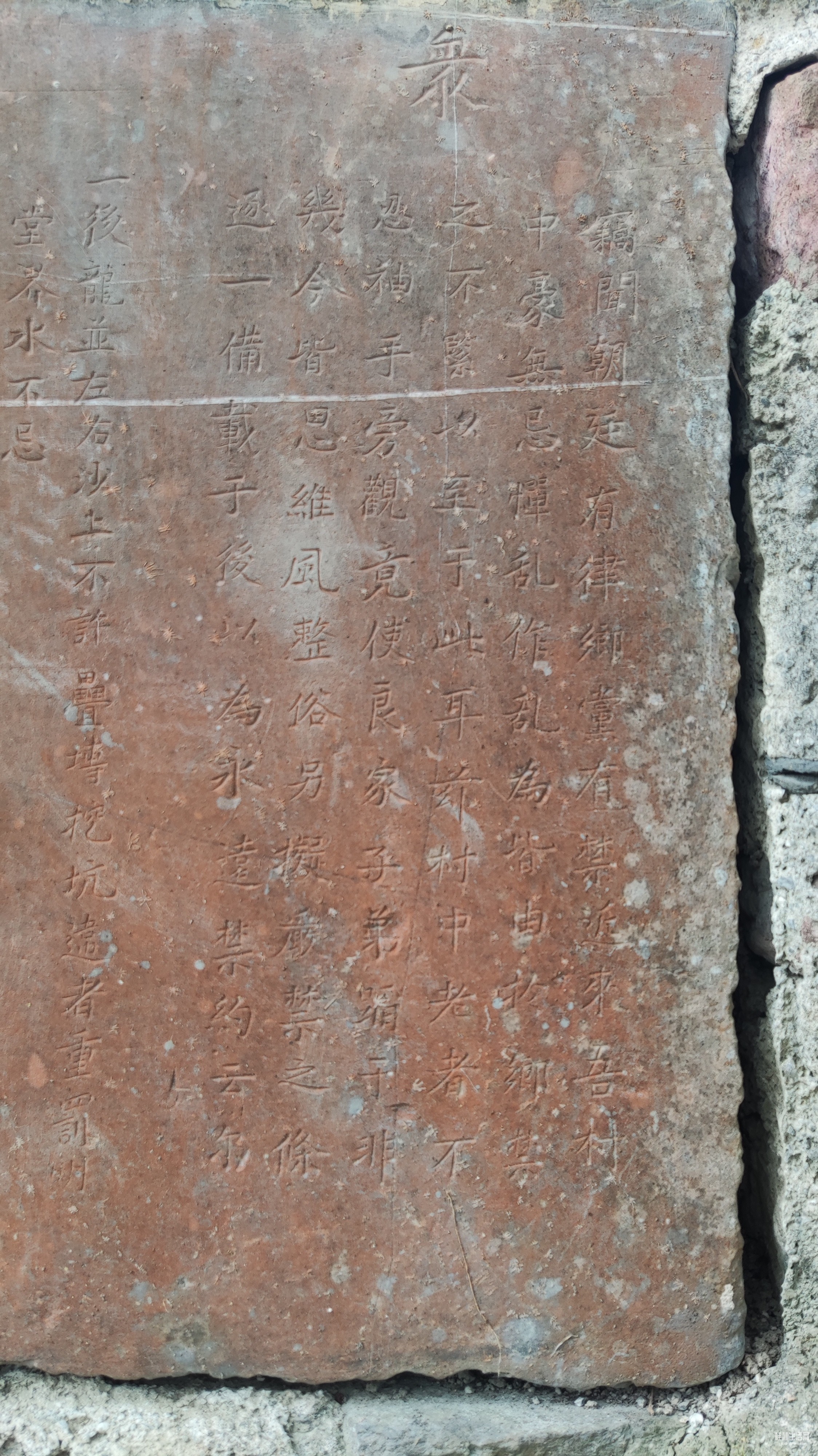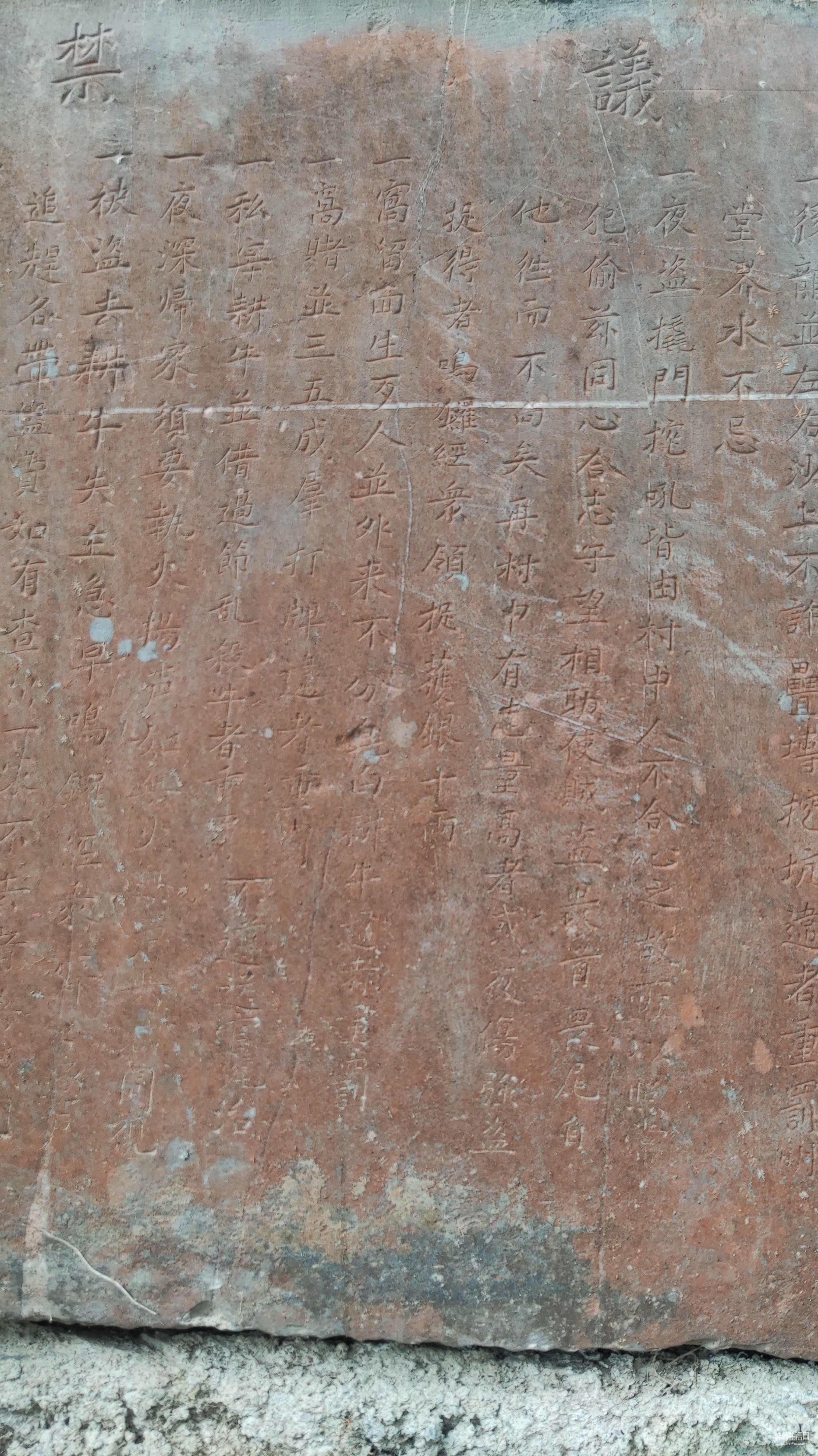 禁碑序言:窃闻朝廷有律,乡党有禁,近来吾村中,豪无忌惮,乱作乱为皆由于乡禁之不紧,以至于此耳兹。村中老者不忍袖手旁观,竟使良家子弟蹈于非几,今皆思维风整俗另拟严禁之条,逐一备载于后,为永远禁约云尔。