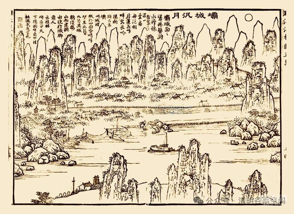 清代画家张宝由桂江溯流而上游漓江,来到桂林,将漓江所见绘制成图画:“余在桂林客馆,曾写《漓江泛槎图》三丈余,自昭州至桂林二百余里,万峰排列,漓水环绕其间”。张宝的《漓江泛槎图》中有描绘阳朔城景的《壩城泛月》,一幅精彩的山水之城写真。张宝的《壩城泛月》画题及所题诗文中多处提及“壩城”,这“壩城”地名的缘起扑朔迷离,阳朔就是阳朔,何来“壩城”一说?
