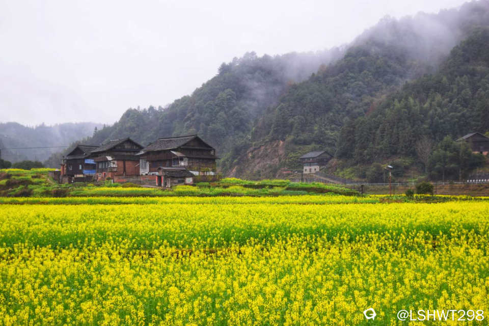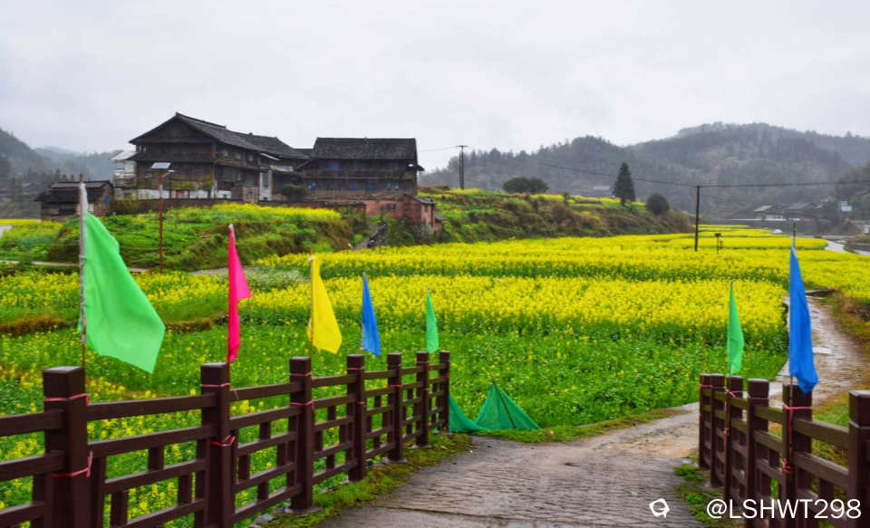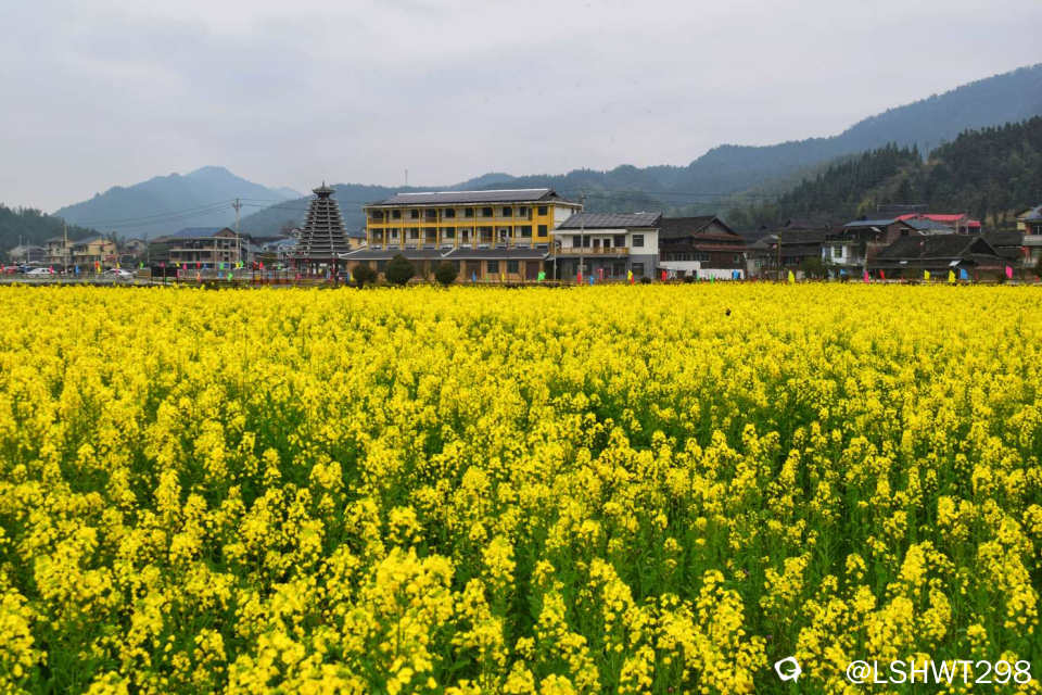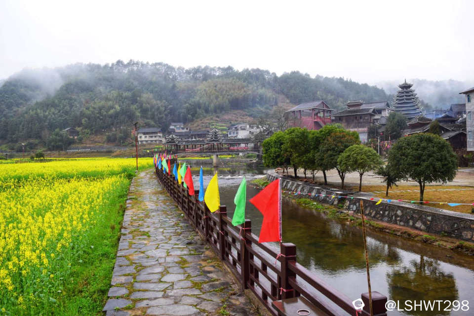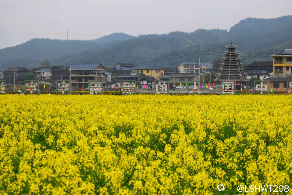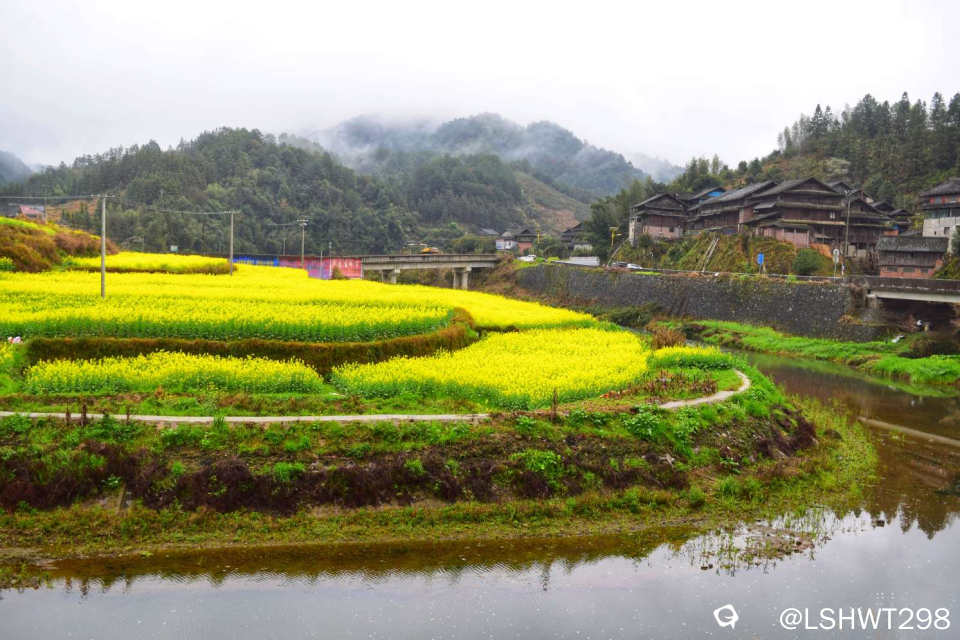 横岭侗寨,始于明朝天顺年间,位于通道坪坦乡河畔,背靠青山,三面环水。古香古色的青瓦吊脚楼被油菜花田包裹其中,极其赏心悦目。。。