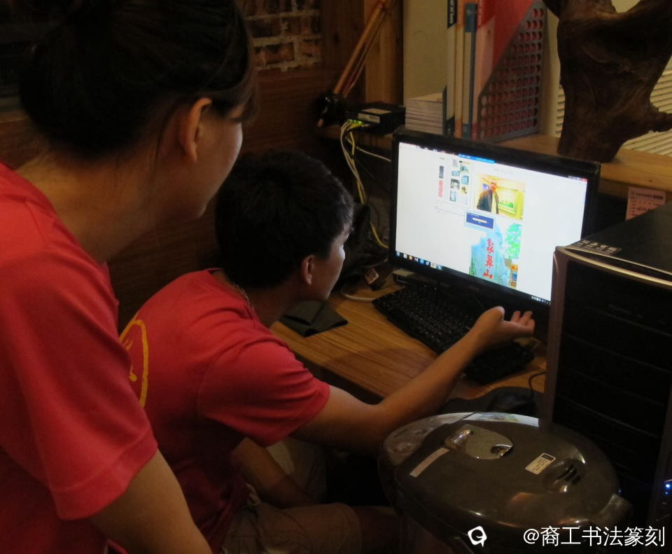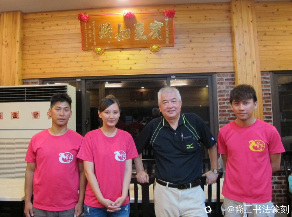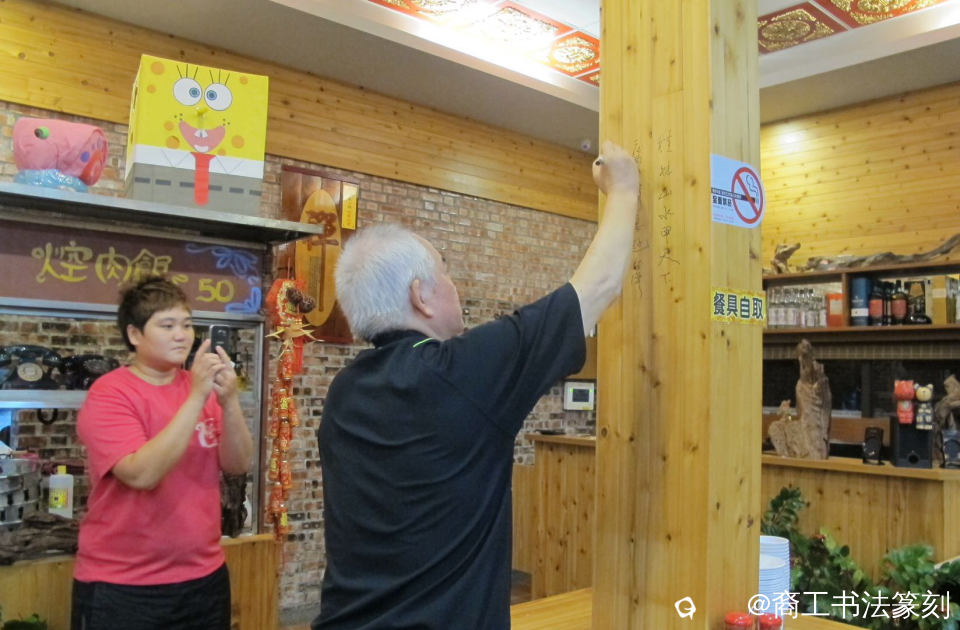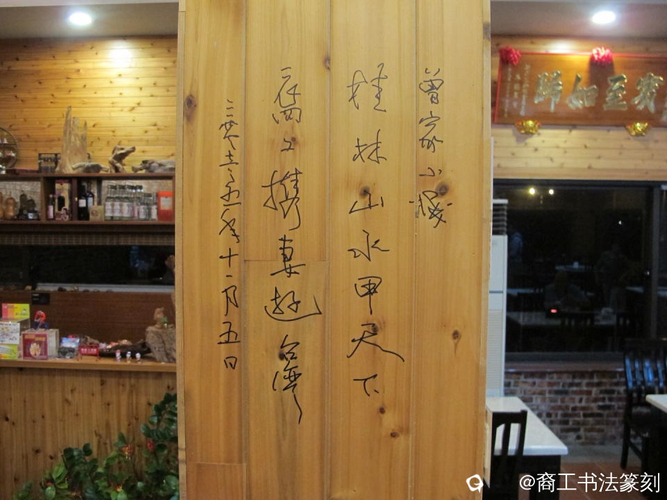 同行朋友介绍他们去网路上查我的名字,果然惊讶!此人就在眼前。马上叫来老板姐弟,找来油彩笔请我题字:“桂林山水甲天下 裔工携妻游台湾”。