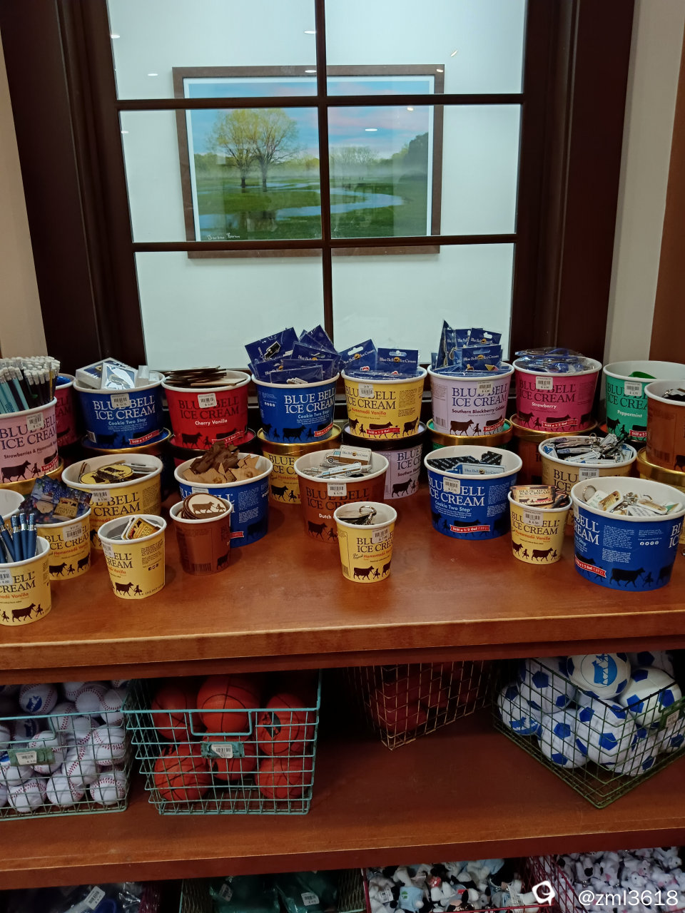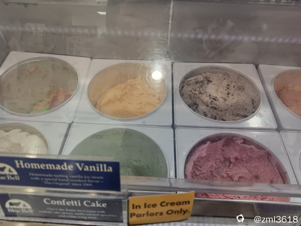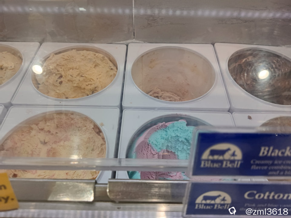 蓝铃铛花冰激淋的产品展示墙。在米国的各超市,商场,餐馆,等等都有他们的产品。