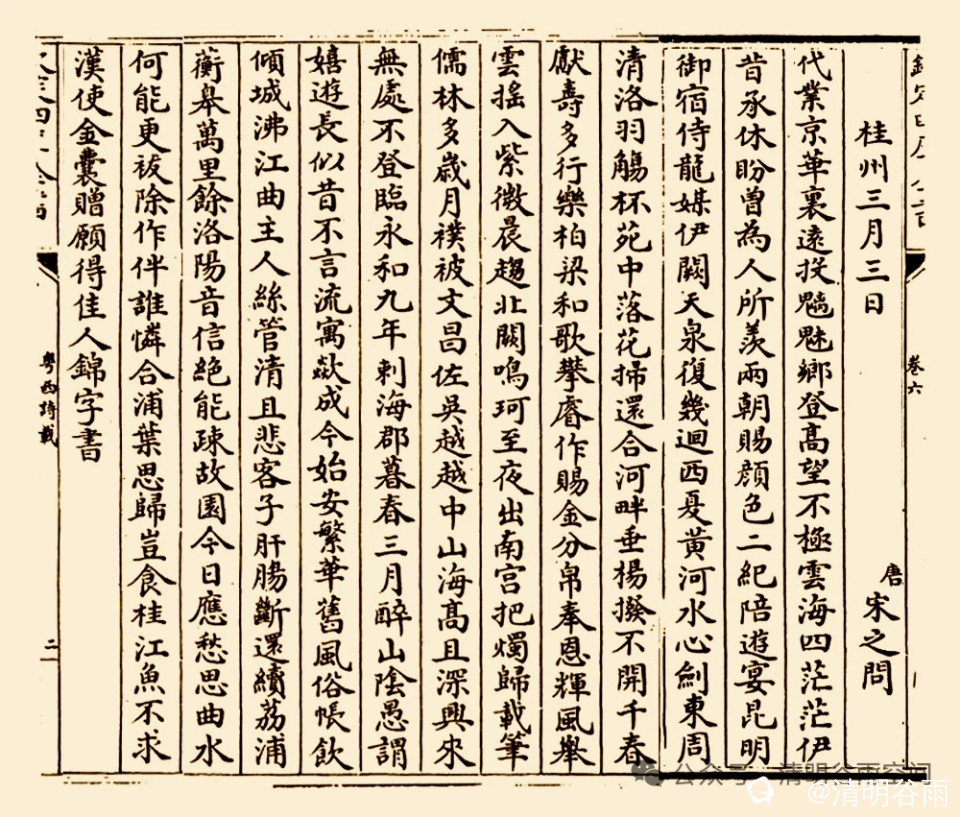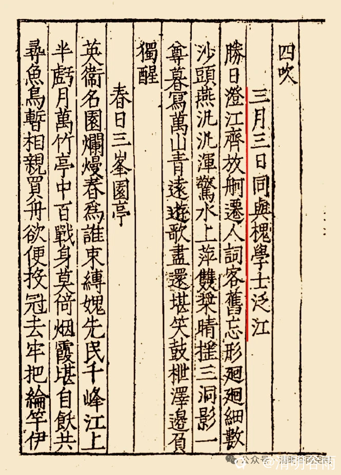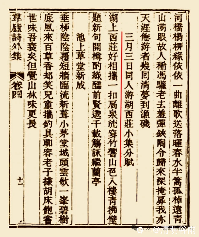 清咸丰年间,南丰诗人赵德湘游桂林,作三月三《修禊日涂春樵司马招集五咏堂次韵》:“手折苕华荫桂旗,读书岩畔忆延之。一峰金碧将军画,三日莺花曲水诗。插柳遨头新禊事,入林把臂旧交知。使君豪饮风流甚,恰喜流觞有月池。”这是一首很精彩的上巳诗,修禊的地点有特色,王城贡院独秀峰下的五咏堂、读书岩,广西文脉发祥地。“流觞有月池”“莺花曲水诗”,意境悠然。诗中有注“宾主如竹林之数”,意为这天的修禊活动效法魏晋时期“竹林七贤”典故,到场的文人恰如“竹林七贤”之数,名士雅集、贤才汇聚。