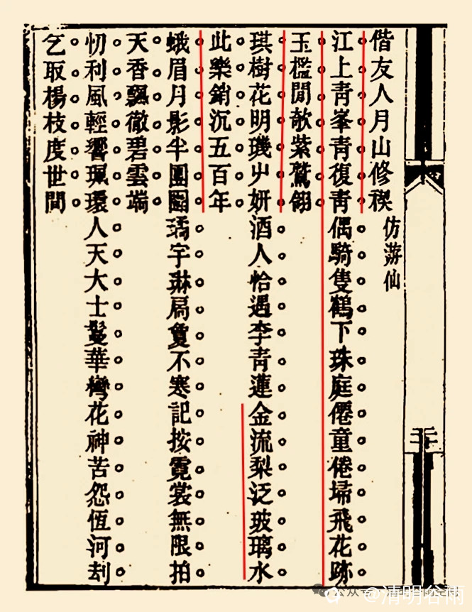 清末光绪六年进士刘名誉是桂林本土诗人,善写桂林风景,曾参与总篡光绪版《临桂县志》,其《竹雨斋诗抄》集中有《偕友人月山修禊 . 仿仙游》诗,记述了清末桂林的三月三禊事。诗云“江上青峰青又青,偶骑朱鹤下朱庭。仙童倦扫飞花迹,玉槛闲欹紫鹫翎”。又称“金流梨泛玻璃水,此乐消沉五百年”。刘名誉的修禊诗作没有禊事活动的写实,诗跋称之“仿游仙”,也就是形容三月三上巳节活动如同神仙春日畅游山水,其乐无穷。