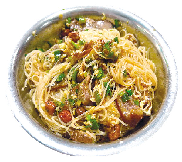 ◤谢明荣正在切凉拌红油米粉的卤味。