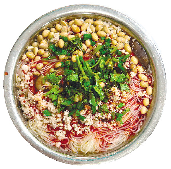 ◥搅拌均匀的凉拌红油米粉,色泽诱人。